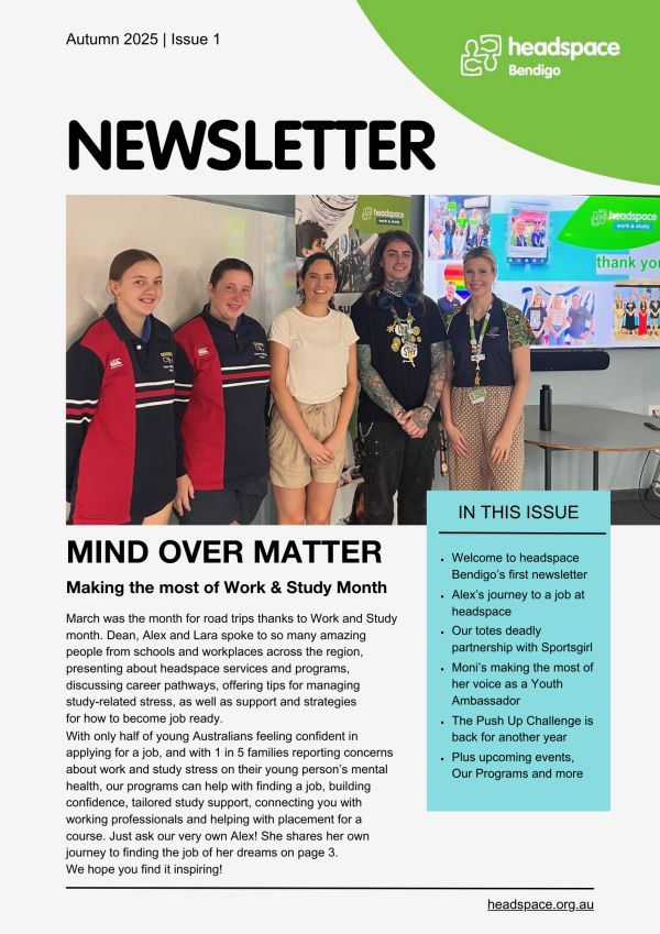 We hope you enjoy our first newsletter. Inside our Autumn edition you can read about Work & Study Month and Alex's journey to a job at headspace; our totes deadly partnership with Sportsgirl; meet one of our Youth Ambassadors; get all the details on our upcoming Push Up Challenge; our programs plus more.