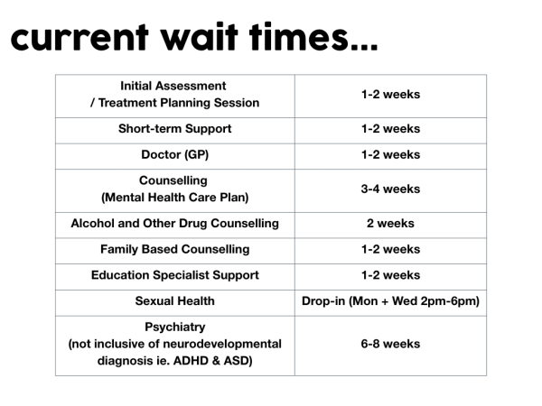 We are a place for young people (aged 12-25) who need some help or support with mental health, physical health, or work & study. Our services are free to young people who have a Medicare card.