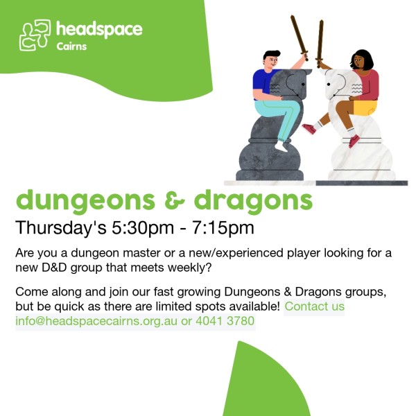 If you're an avid Dungeons & Dragons player register your interest to be part of the headspace Cairns D&D group. Facilitated by our experienced dungeon masters headspace Cairns invites you to participate in our next campaign.
