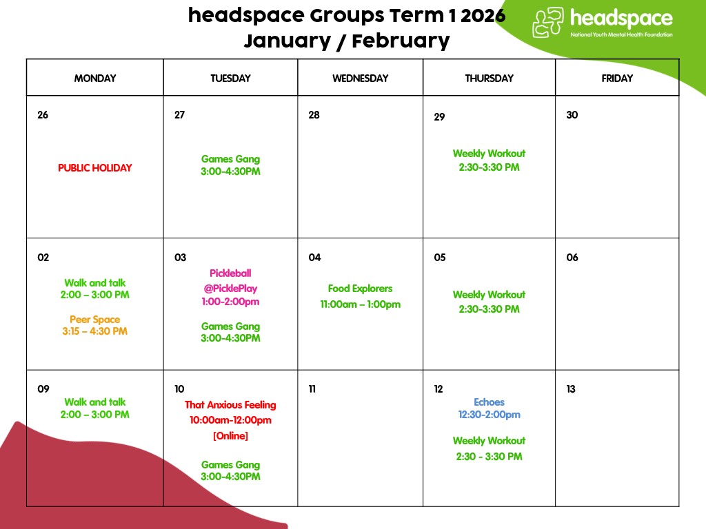 If you would like to know more about what's going on at headspace Elsternwick / Bentleigh take a look at our Term 1 Groups Timetable for 2026!