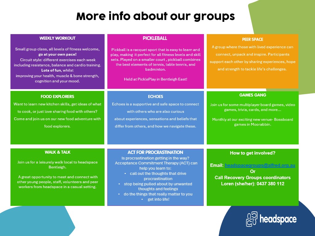 For all new group registrations please contact our Group Coordinator Loren on 9076 9400 or email headspacegroups@alfred.org.au and arrange a welcome appointment.
