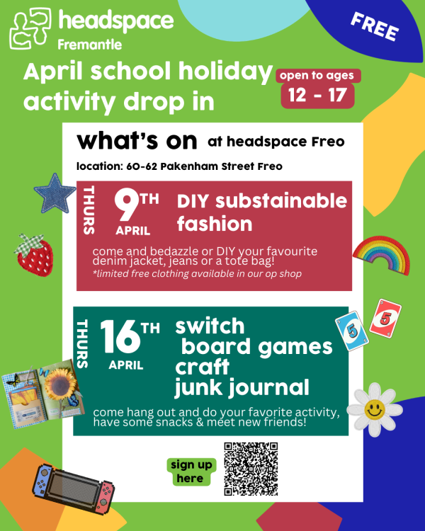 Come chill out with drop in activities every Thursday in April School Holiday Youth Drop-In at headspace Freo!