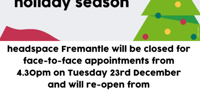 headspace Fremantle will be closed from 4. 30pm on Tuesday 23rd December. We will reopen from 8:30am on Monday 5th January... -