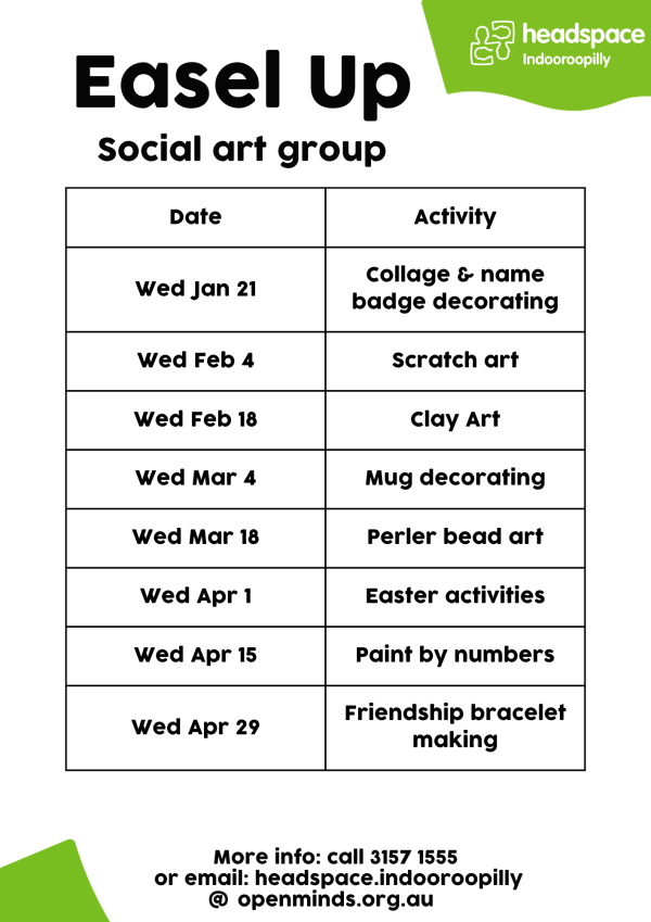 Contact us on (07) 3157 1555, email us at headspace.indooroopilly@openminds.org.au or have a chat with reception if you're already in centre.