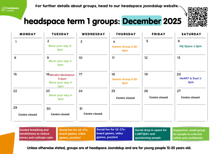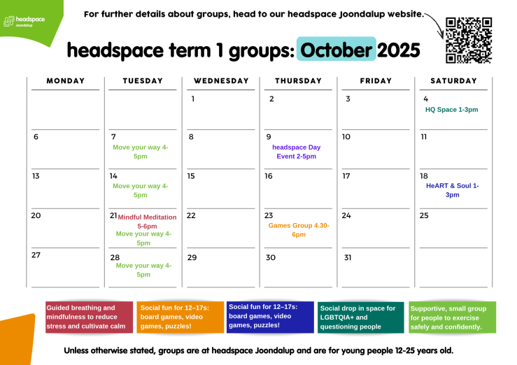 Headspace Joondalup offers a variety of free groups and workshops aimed at supporting young people's mental health and well-being. For more information email info@headspacejoondalup.com.au