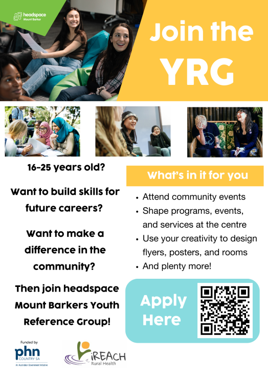 Applications for headspace Mount Barkers Youth Reference Group are now open! If you want to build skills for future careers and make a difference in the community then Apply Here
