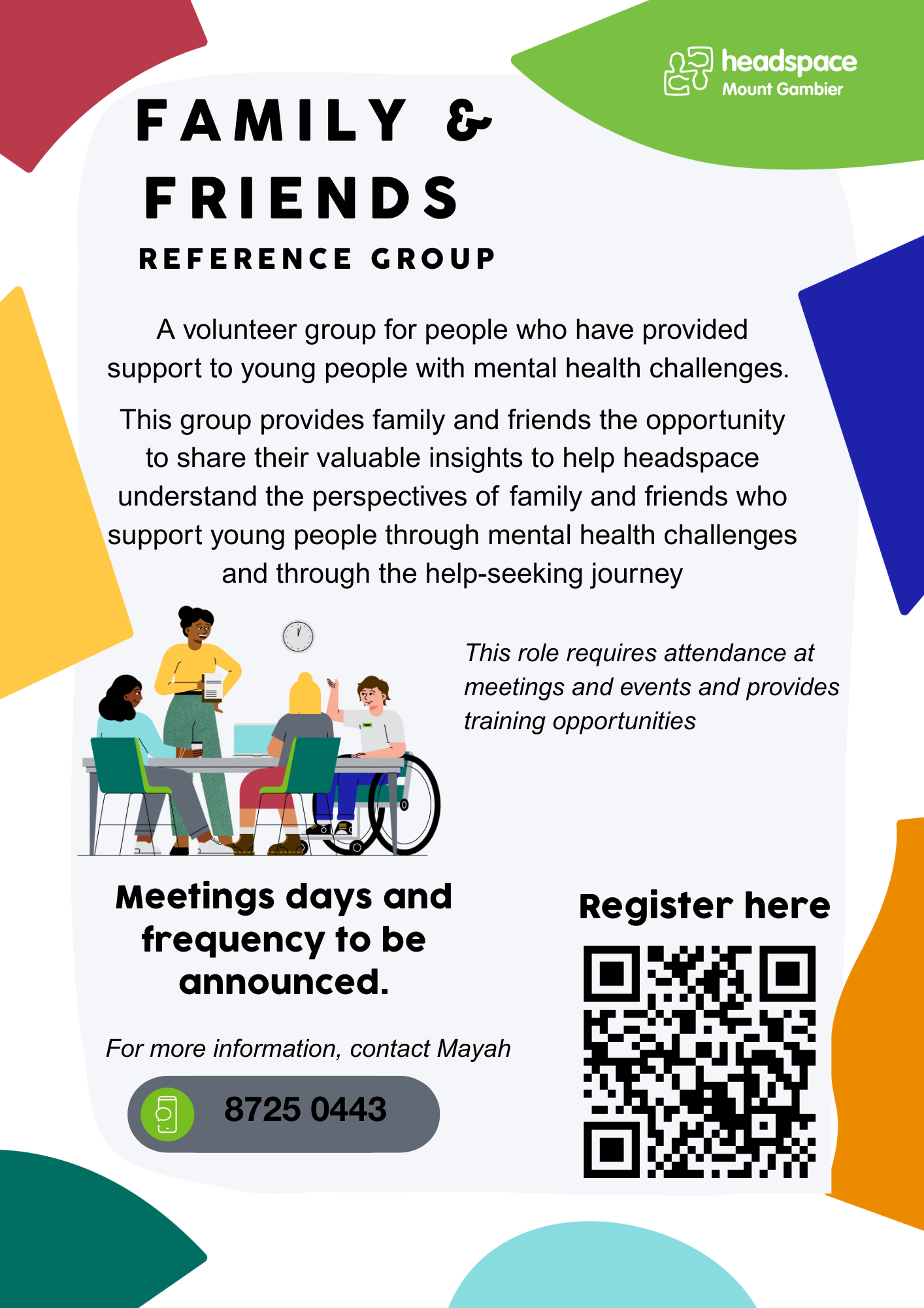 Our Family and Friends Reference Group (FaFRG) is a group of people who have lived experience of supporting a young person who has accessed headspace services. The FaFRG advocate for the contribution and the needs of families and friends of young people across headspace groups and programs.