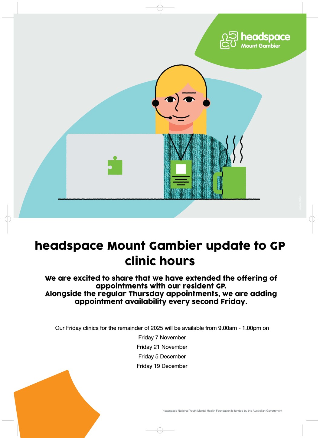 The headspace Mount Gambier Youth Health Clinic is a FREE medical service just for young people 12-25.
