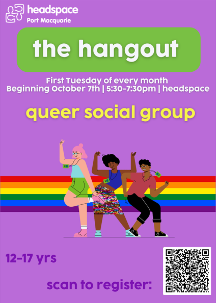Note: We currently are not running any over 18s LGBTQIA+ social events, however we often partner and collaborate with Out Loud and Proud Port Macquarie (OLP) and Cheers Queers who run local events for adults in the queer community. As supporters of Headspace, OLP and Cheers Queers often offer sweet discounts to their events, so if you are a client of ours aged 18-25yrs, then email headspaceCE@each.com.au to see what's on. If you wish to know more about these local groups you can connect here www.cheersqueersevents.com/ or via facebook OutLoudProudPort Mac.