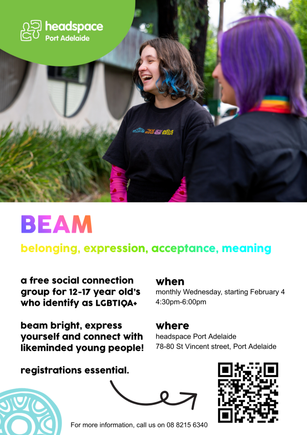 BEAM is a free social connection group for young people aged 12-17 who identify as LGBTIQA+ or as an ally of the queer community. BEAM is a safe and inclusive space for you to be yourself, meet like-minded people, have fun, and learn a little bit about looking after your mental health along the way!