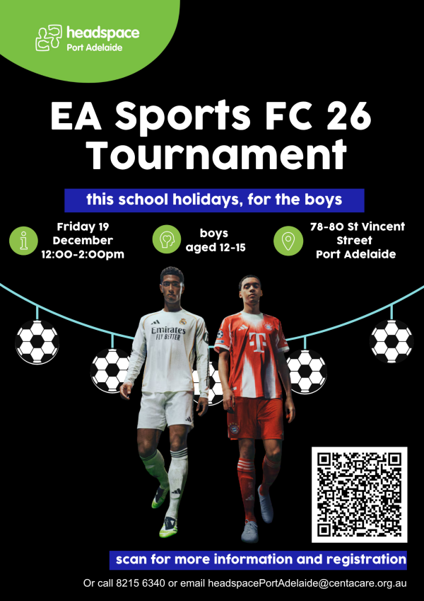 For more information, call 08 8215 6340 or email headspacePortAdelaide@centacare.org.au
