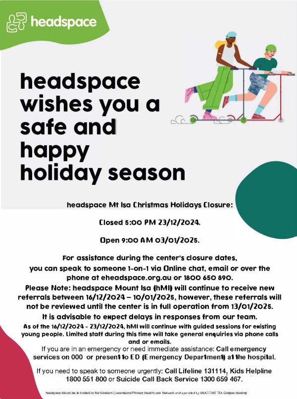 headspace Mount Isa is a free health service for young people ages 12-25. We offer free support in person, over the phone and as well as video appointments. These services include advice and listening, brief interventions, counselling by qualified professionals and help with school, work and study